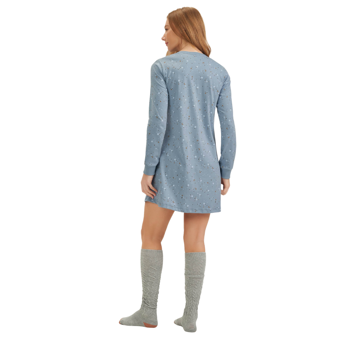 Camisola manga longa em malha comfort 100% algodão com decote e punho canelados e bolso lateral com estampa sublimada. Peça em tom de azul claro, que inspira conforto e aconchego para seu descanso. Toque macio e suave e com caimento perfeito, que te envolve num clima gostoso de maciez e suavidade. Ela vem acompanha de um meião de algodão mescla com detalhe trançado. Também na versão short doll 🙂