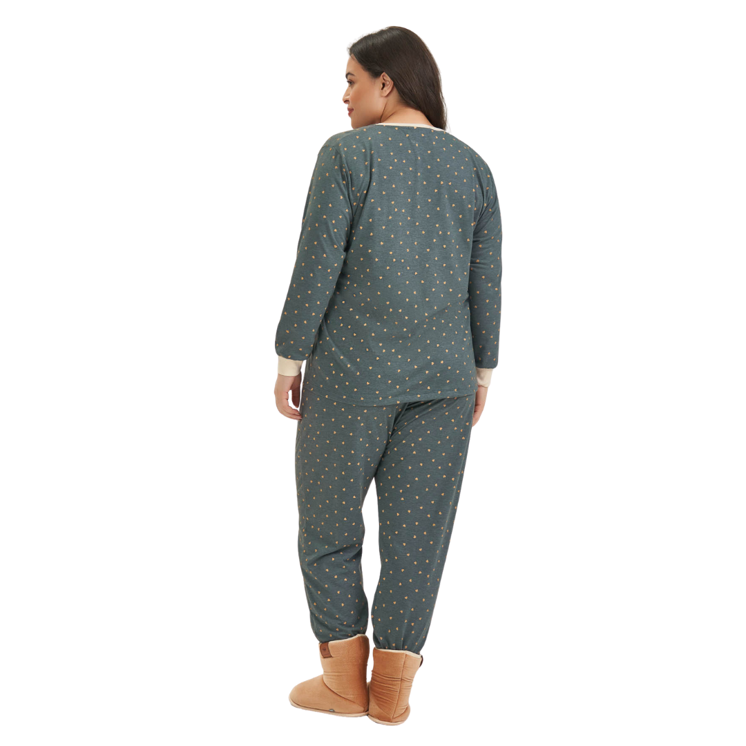 Pijama de inverno plus size com blusa de manga longa e calça jogger. Macio, confortável e com detalhes delicados para noites quentinhas e estilosas.