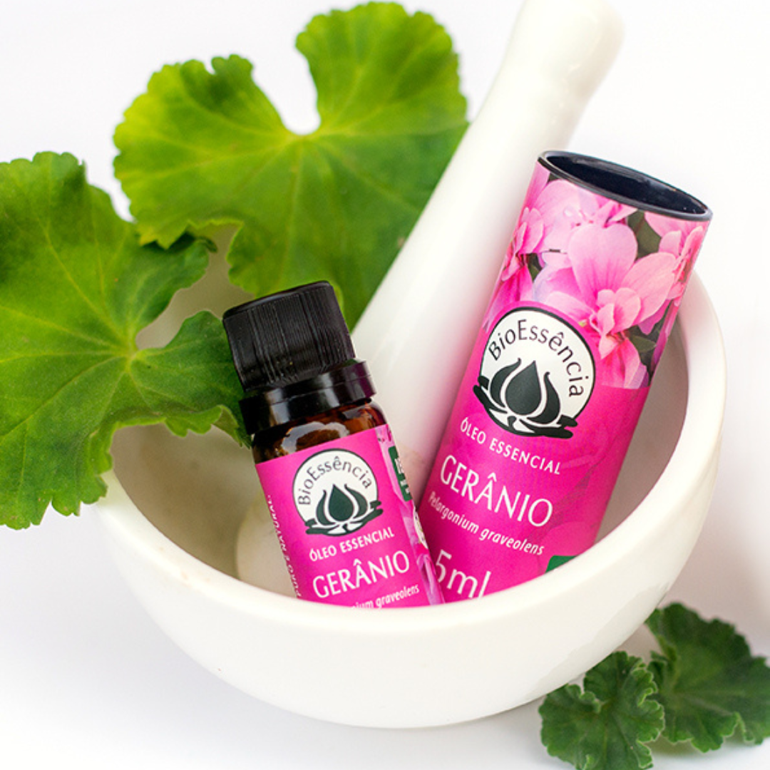 O óleo essencial de gerânio possui aroma floral suave que estimula o amor-próprio, equilibra emoções e ajuda a criar um ambiente relaxante ideal para o ritual de dormir.