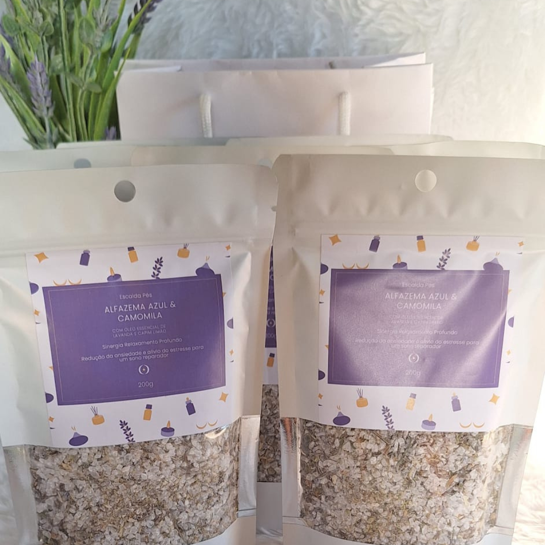 Uma combinação perfeita de sal grosso marinho , alfazema azul, flores de camomila com óleos essenciais de lavanda e capim limão.