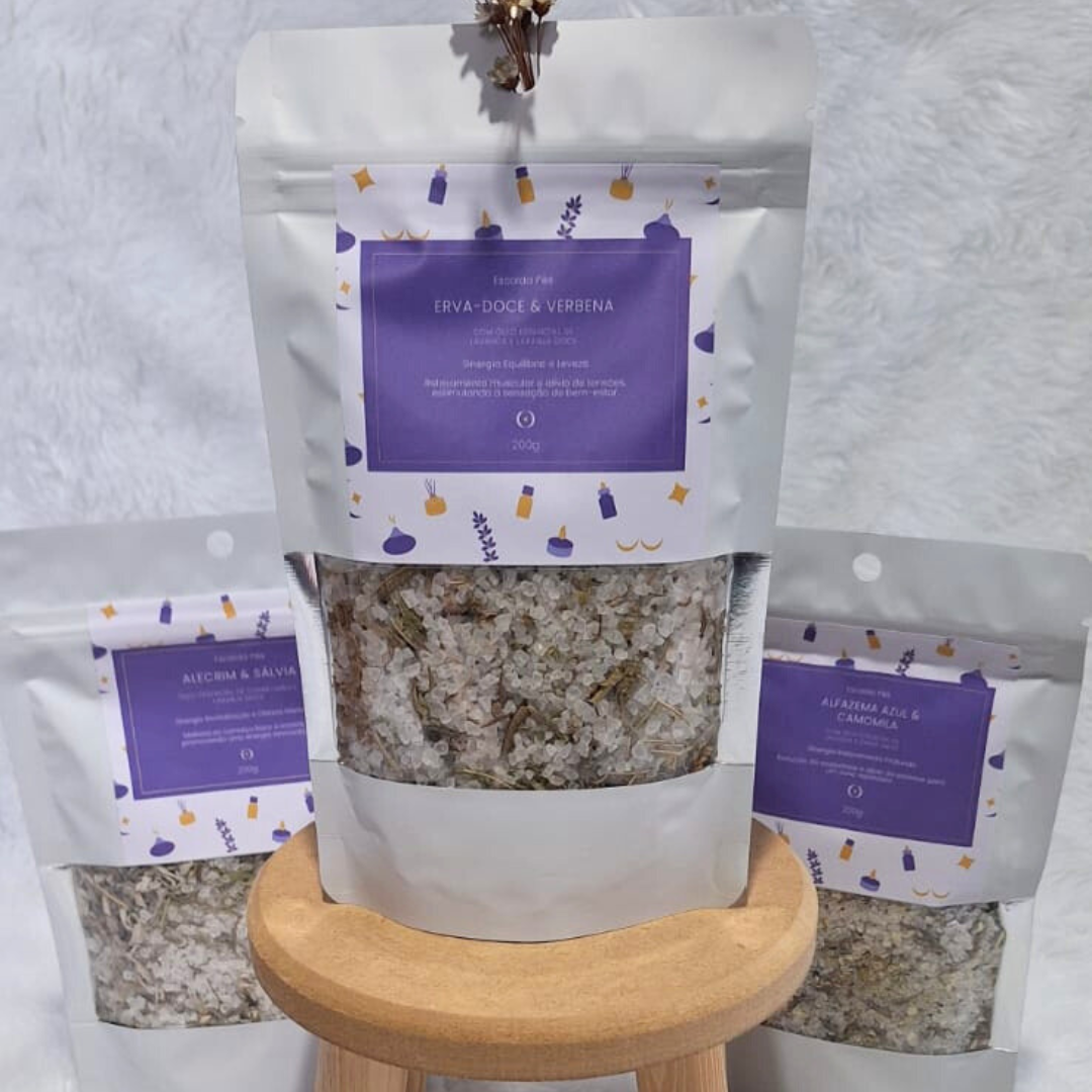 Essa sinergia traz o sal grosso marinho, o toque suave da erva doce e a delicadeza mística das folhas secas da verbena. Ainda contam com a suavidade do óleo essencial de lavanda e a alegria do óleo essencial da laranja doce para relaxar e acalmar.