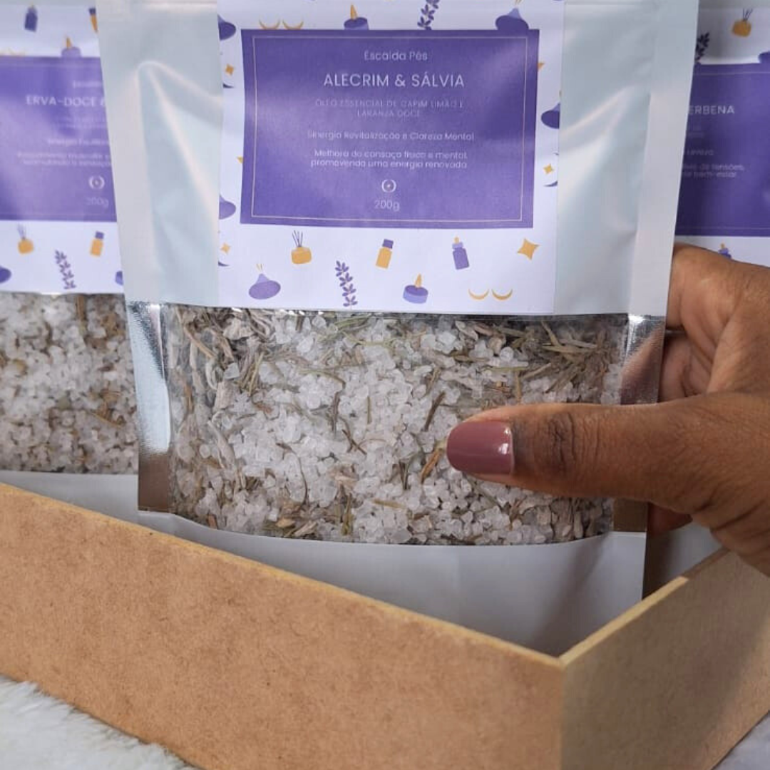 Composto por 20 escalda pés de 200 gramas que combinam ingredientes naturais e óleos essenciais que foram cuidadosamente escolhidos para proporcionar relaxamento profundo, alívio do estresse e sensação de bem-estar. Basta adicionar 3 colheres do produto em água morna e desfrutar de 20 minutos de puro descanso pós evento !
