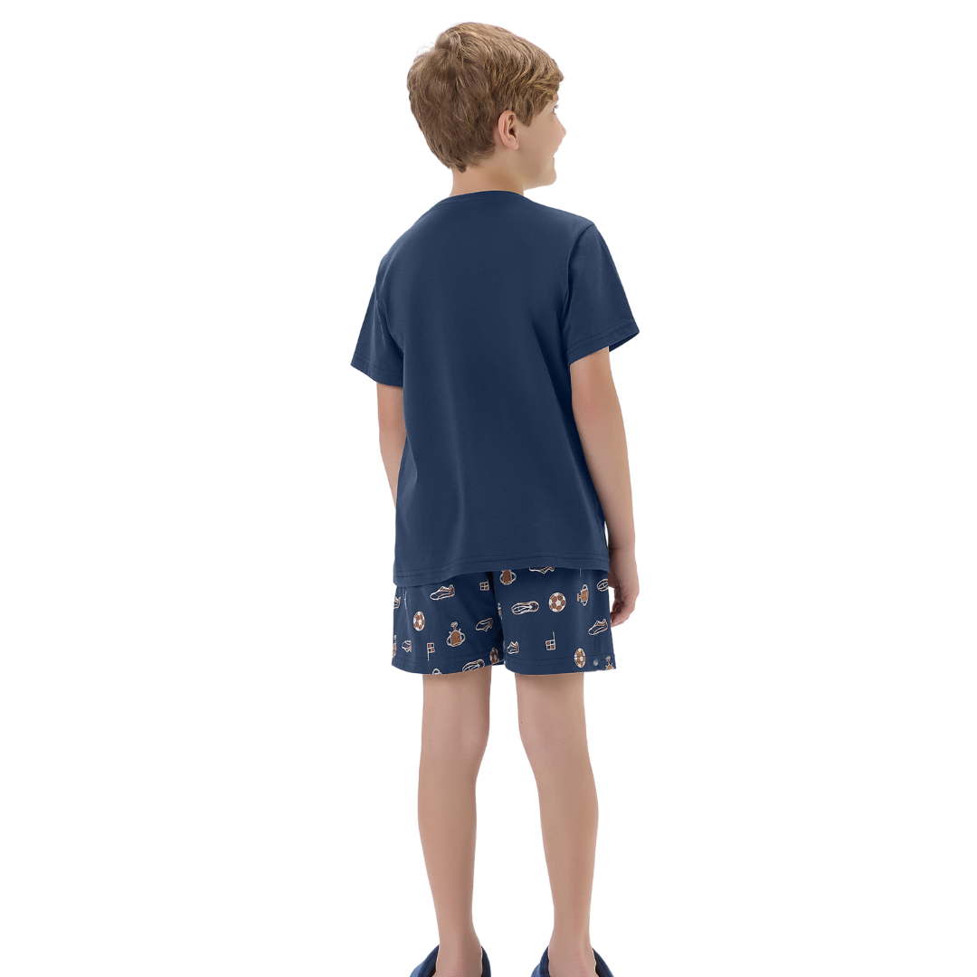 Esse pijaminha é perfeito para os pequenos apaixonados por futebol que não abrem mão de conforto na hora de descansar. Confeccionado em algodão macio e respirável, o conjunto garante toque suave na pele e liberdade de movimento, ideal para noites tranquilas e momentos de lazer. A blusa em azul marinho traz estampa localizada de futebol, com bola, chuteira e taça, além da frase “Ready to play”, que destaca o estilo esportivo e divertido da peça.