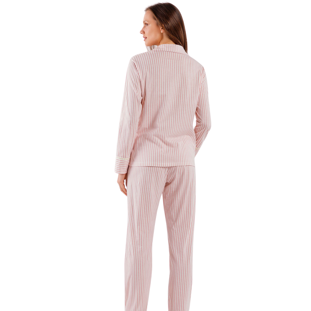 Pijama longo 100% algodão, com listras rosa, abertura frontal e detalhes lúdicos. Ideal para noites de puro conforto e charme.