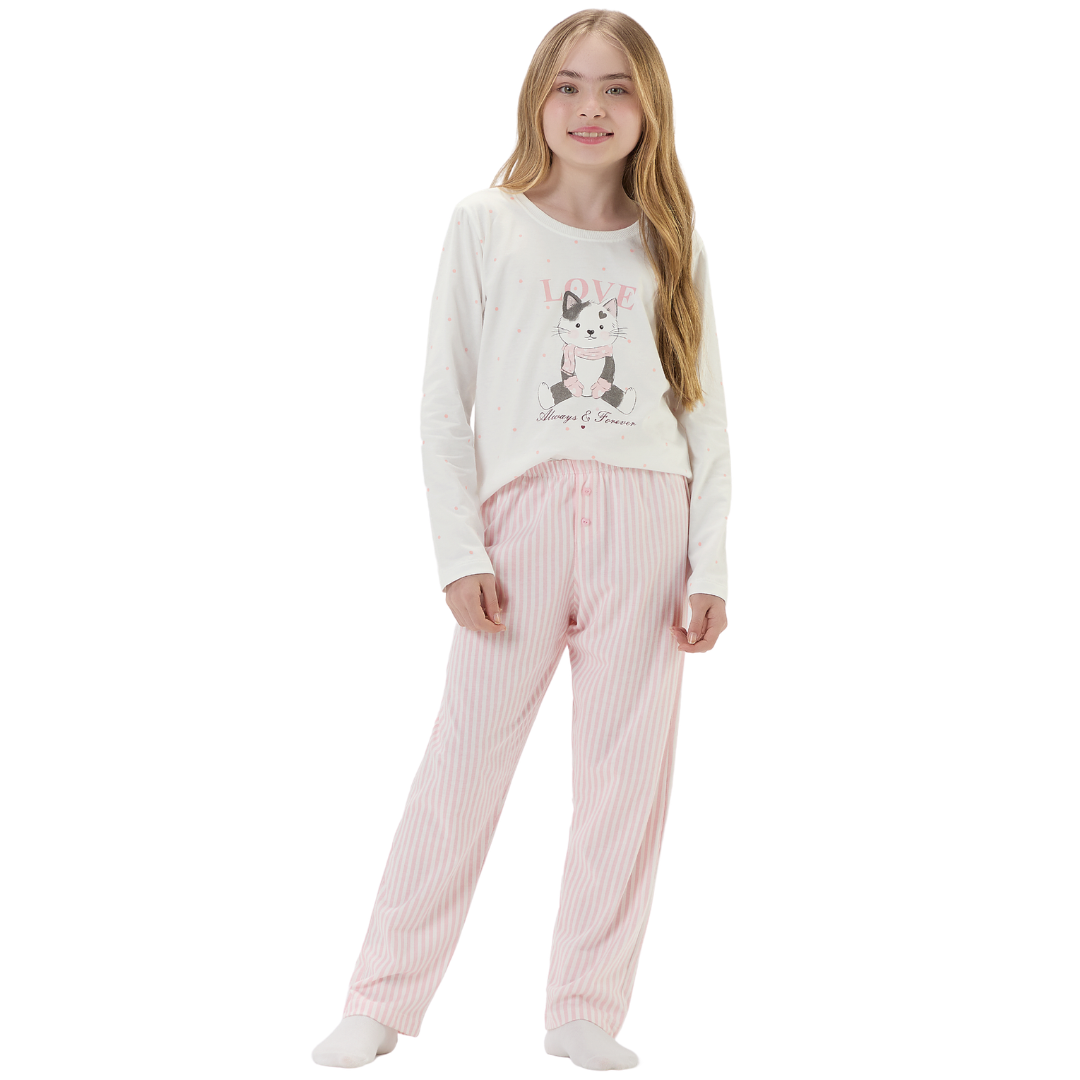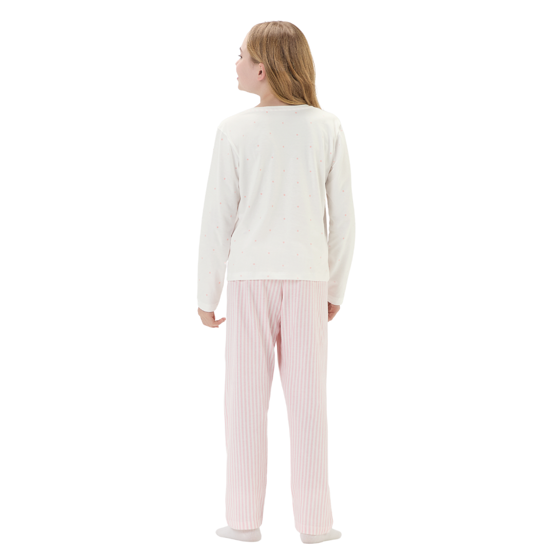 A calça com fundo off-white e listras rosas complementa o look com modelagem confortável e botões decorativo rosa no cós, trazendo um toque feminino e alegre. Um pijama leve, fofo e aconchegante, perfeito para noites tranquilas e momentos de descanso. A modelo veste tamanho 8.