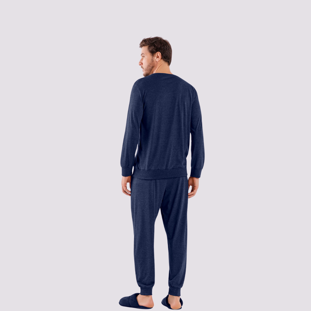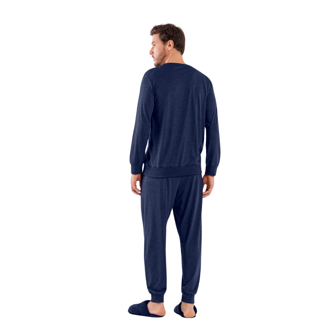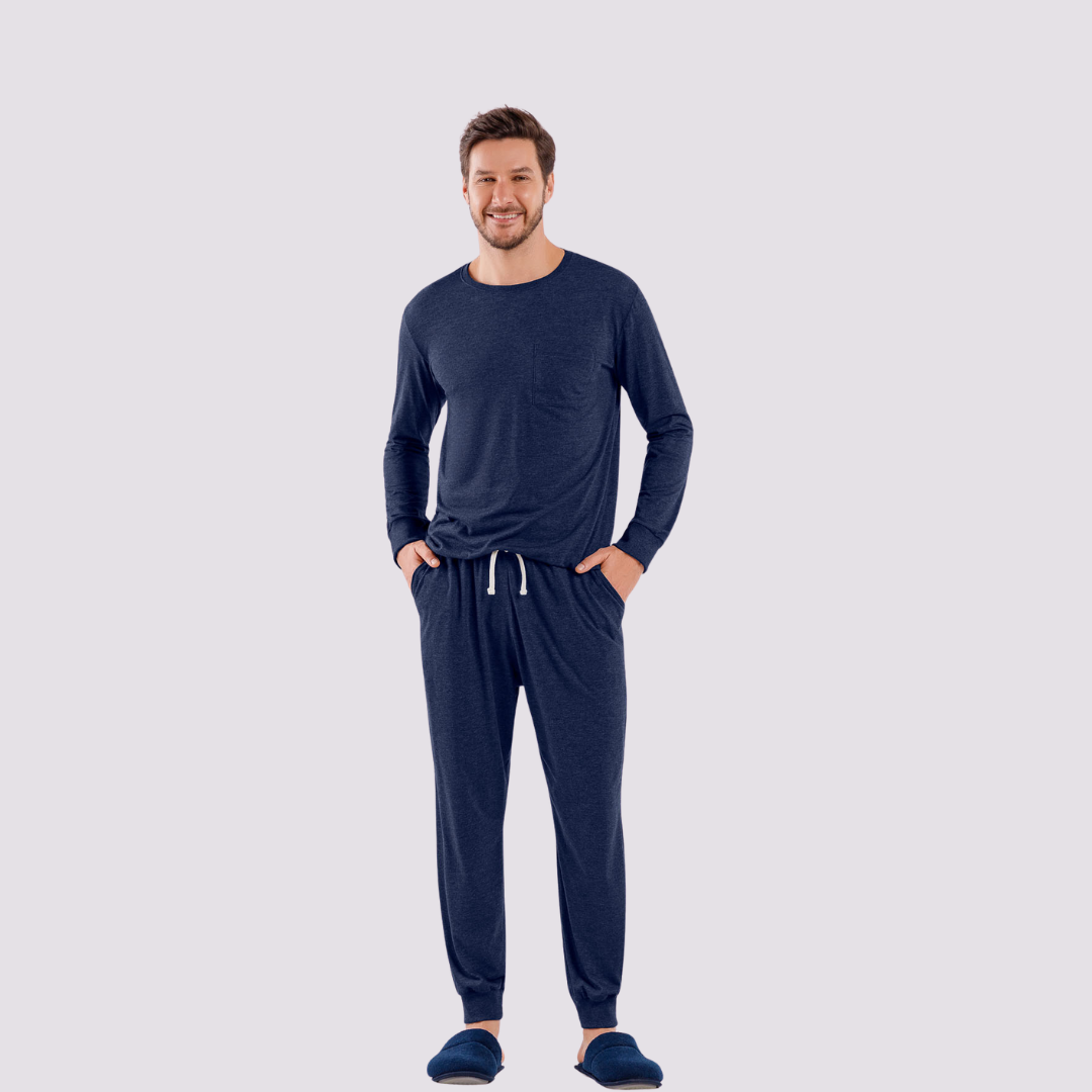 Pijama masculino de inverno em malha blend. Blusa com bolso lateral e calça jogger. Num tom de cinza chumbo para noites frias com muito estilo e conforto.